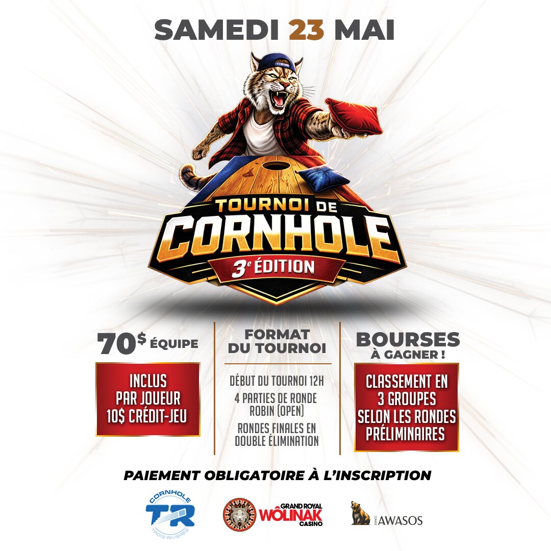 Les inscriptions sont maintenant ouvertes pour la 3e édition de la Classique du Grand Royal Wôlinak, un tournoi de cornhole ouvert à tous les niveaux.