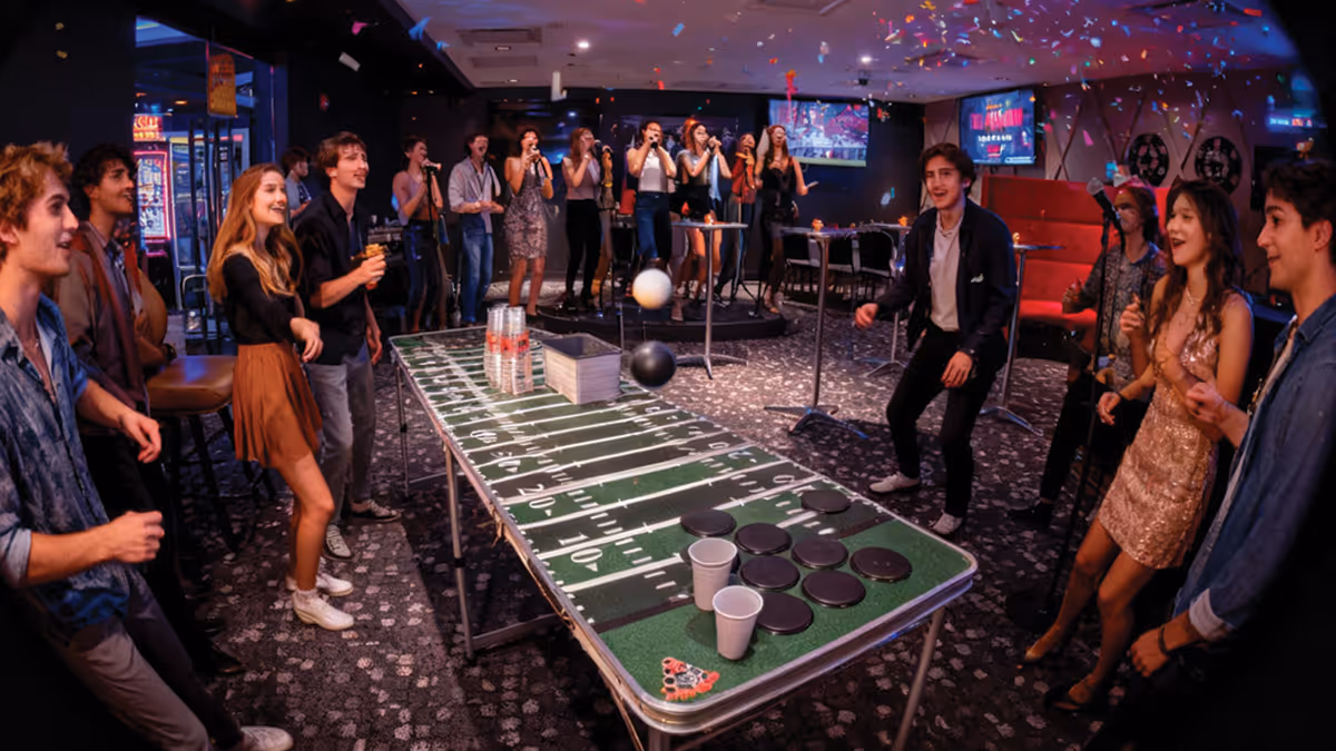 Ambiance festive avec karaoké, beer pong, télévisions et divans — tout pour une soirée mémorable dans notre salon privé Le Lounge Royal!